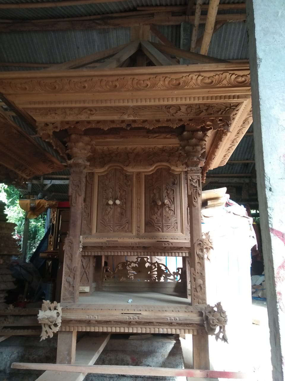 Pelinggih rong 2 yang bahanya dari kayu nangka bali yang berkwalitas dengan motif ukiran full di kombinasi dinding wayang (panil) modern,dengan ukuran 60×60 cm motif  jajar sari atau jajar tungked sesuai pesanan